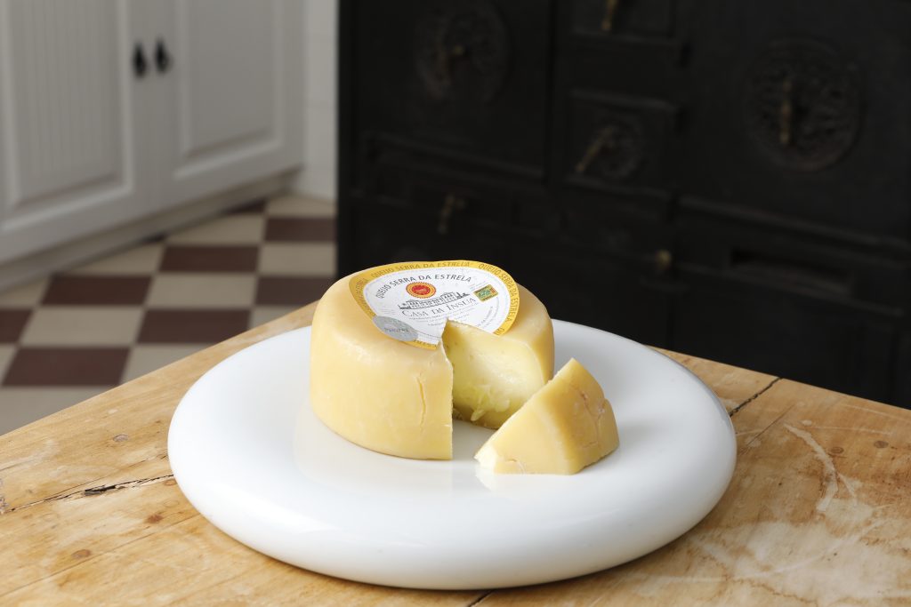 queijo Serra da Estrela DOP, um queijo de pasta semi-mole, com crosta amarelo palha claro,