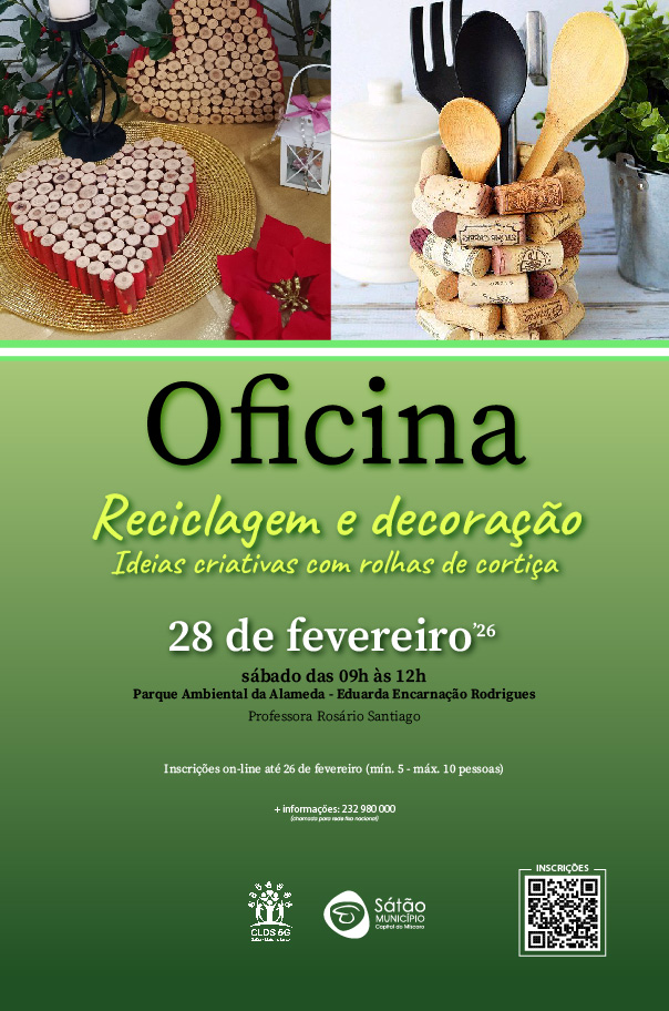 No próximo dia 28 de fevereiro de 2026, sábado, o Município de Sátão promove, no Parque Ambiental da Alameda Eduarda da Encarnação Rodrigues, a oficina “Reciclagem e decoração: ideias criativas com rolhas de cortiça”, das 09h00 às 12h00, com a colaboração do CLDS 5G de Sátão.