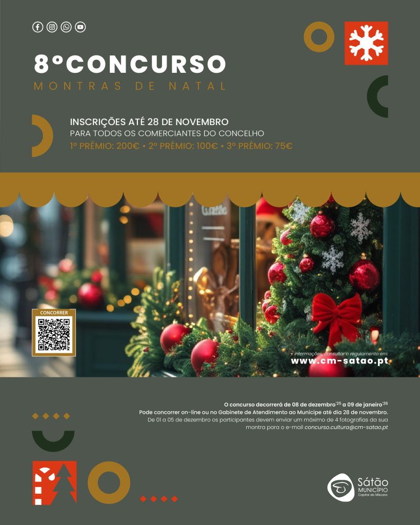 Com a chegada da época natalícia e para valorizar o comércio local, trazer mais encanto às ruas e dar um toque especial e festivo ao concelho, o Município de Sátão promove a 8ª Edição do Concurso de Montras de Natal. As inscrições decorrem até ao dia 28 de novembro, para todos os comerciantes do concelho com montra visível a partir do espaço público. As votações do público são de 08 de dezembro a 09 de janeiro de 2026. As inscrições devem ser realizadas online, através do preenchimento do formulário disponível em https://www.cm-satao.pt/balcao-virtual/formularios/concursos/montras-de-natal; ou presencialmente no Gabinete de Atendimento ao Munícipe. Para mais informações, os interessados devem consultar o regulamento disponível no site do Município em www.cm-satao.pt.