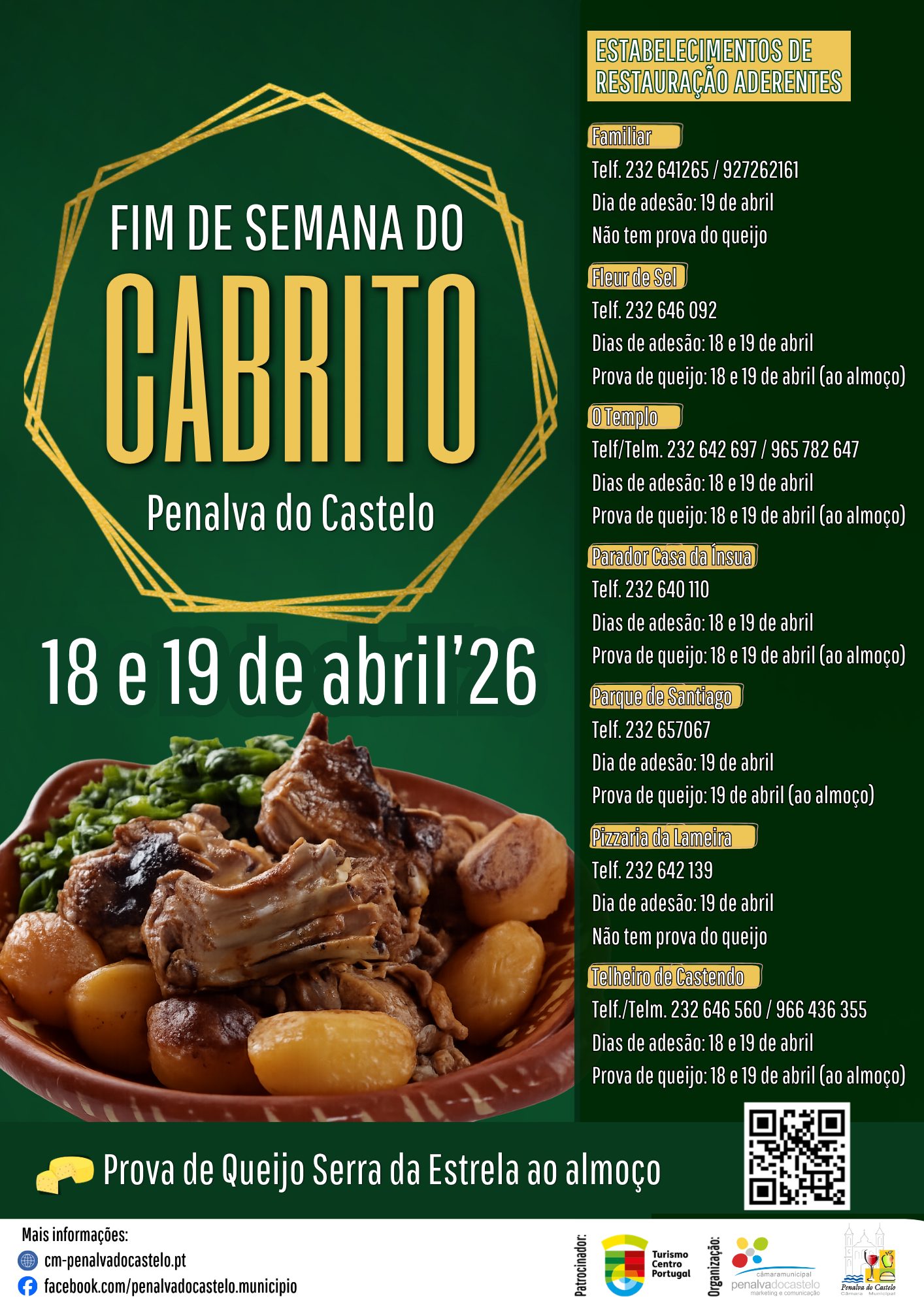 Penalva do Castelo prepara dois dias, repletos de atividades, com destaque para o evento gastronómico “Fim de Semana do Cabrito”. Para além do prato principal, o cabrito, os restaurantes aderentes irão também servir produtos de excelência da região, como o queijo Serra da Estrela e a maçã Bravo de Esmolfe.