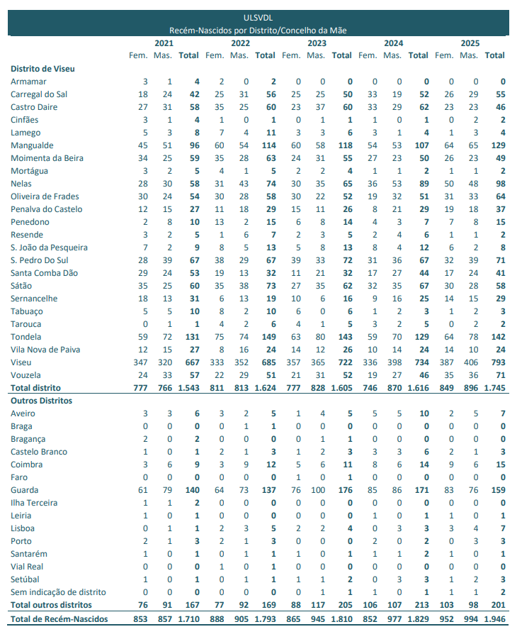 Em 2025, a Unidade Local de Saúde de Viseu Dão-Lafões (ULSVDL) registou um total de 1.946 nascimentos, um valor superior ao registado em 2024, que ascendeu aos 1.829, correspondendo a um aumento de 6%, segundo os dados do Serviço de Obstetrícia e Ginecologia.